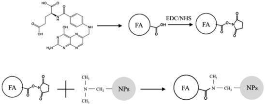 NCs were covalently functionalized to obtain active targeting towards cancer cells, using folic acid (FA, Mw: 441.4 Da) as the ligand to be bound on the surface of the nanoparticles. First, carboxyl groups of FA were activated to favor the interaction with the amino groups of the material. A 0.045 M FA solution in dimethyl sulfoxide (DMSO) was prepared. Subsequently, 1-Ethyl-3-(3-dimethylaminopropyl)carbodiimide/N-Hydroxysuccinimide (EDC/NHS) were added (FA/EDC molar ratio 1:1, EDC/NHS molar ratio 3:1) and the solution was kept under mild magnetic stirring at room temperature for 18 h to favor the activation of the FA carboxyl groups. At the end of the incubation period, the unreacted EDC/NHS was removed via dialysis against water. Once FA was activated, NCs were dispersed in the solution (NCs/FA weight ratio 1:1) by sonicating them for 1 min at the maximum power using a bath sonicator (Branson 1800) and then kept under magnetic stirring at room temperature for 3 h. Finally, NCs were centrifuged (Mikro 200 Hettich Zentrifugen, Tuttlingen, Germany) at 14,000 rpm for 15 min and washed three times with bidistilled water to remove the excess of FA. A schematic of the reaction is shown in Figure 1.