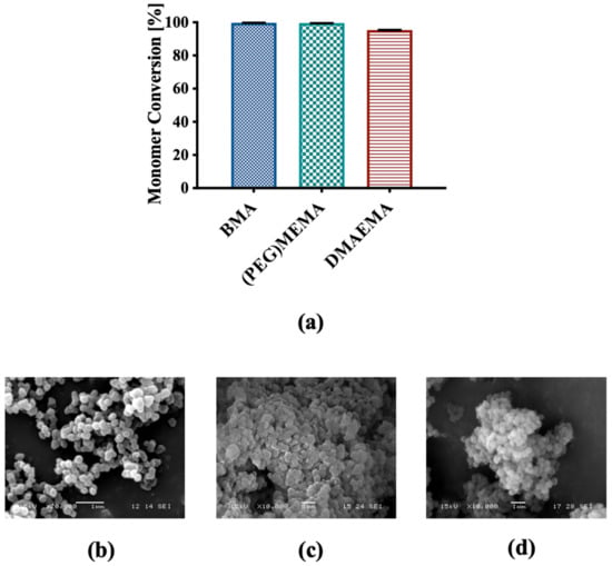 (a) Percentage conversion for each monomeric unit; SEM representative micrographs of (b) PMMA sacrificial core, (c) NCs before and (d) after extraction of the core.