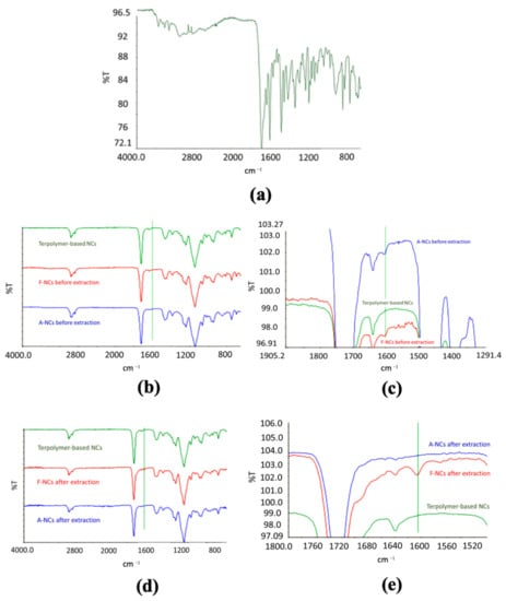 FT-IR analysis. (a) Spectrum of folic acid; (b) comparison among the spectra of pure terpolymer-based NCs, functionalized NCs, and NCs after adsorption of FA before extraction and (c) a magnification; (d) comparison between of pure terpolymer-based NCs, functionalized NCs, and NCs after adsorption of FA after removal procedure, and (e) a magnification.