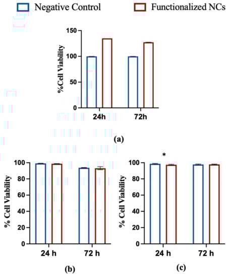 In vitro cytotoxicity tests. (a) Cytotoxicity MTT assay of functionalized NCs after 24- and 72-h incubation with NIH3T3 cells. A comparison with negative control is shown; (b) Propidium Iodide Flow Cytometry assay of functionalized NCs after 24- and 72-h incubation with HeLa cells. A comparison with negative control is shown; (c) Propidium Iodide Flow Cytometry assay of functionalized NCs after 24- and 72-h incubation with NIH3T3 cells. A comparison with negative control is shown (* p < 0,05; t-test; mean ± SD; n = 3).