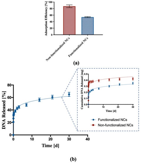 DNA adsorption and release tests were performed on functionalized NCs to determine if the functionalization affected the interactions between polymer and nucleic acid. DNA adsorption test carried out on functionalized NCs showed an adsorption efficiency around 54%, which was lower than the adsorption efficiency of the non-functionalized NCs (87.1%), as shown in Figure 5a.