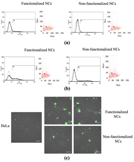 Cell uptake tests were carried out on covalently functionalized, fluorescinated NCs using HeLa cells to investigate their ability to actively target cancer cells overexpressing FA receptors. Non-functionalized, fluorescinated NCs were used as control. In a first set of cellular uptake experiments, HeLa cells were incubated with 100 μg/mL of either functionalized or non-functionalized NCs in complete medium for various incubation times (6 and 24 h) at 37 °C. After the indicated time, the cells were trypsinized and cellular uptake of the two types of NCs was determined by flow cytometry. Uptake of NCs began as early as 6 h after incubation and increased at 24 h, thus revealing that NCs uptake was time-dependent (Figure 6a,b).
