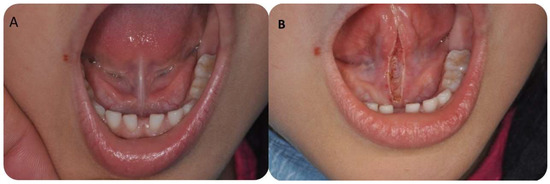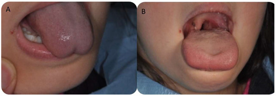This retrospective study was conducted from November 2016 to October 2019. The investigation was conducted in accordance with the ethical principles of the European Union rules on good clinical practice, according to the declaration of Helsinki and the additional requirements of Italian law. The authors treated 30 children (16 female and 14 male) aged from 6 to 11 years (with an average age of 8.8 years) presenting ankyloglossia classified as class III or IV, according to Kotlow’s classification, with the atmospheric plasma technique. All children received a complete oral and lingual examination at the initial visit and standardized photographs were taken (Figure 1, Figure 2 and Figure 3). Post-operative visits were at one week, one month and two months. At each visit, careful attention was paid to lingual movement, mouth opening and lingual scarring.