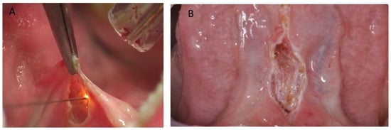 The lingual frenulum was removed using atmospheric plasma also known as voltaic arc dermabrasion (VAD, Europe Medical s.r.l., Montesilvano (PE), Italy). It is known that a local administration of an anesthetic spray (lidocaine spray Ogna S.p.A., Milan, Italy) or infiltration of a few drops of Articaine (Pierrel S.p.A., Milan, Italy) is enough to avoid suffering any pain during this treatment. One incision was by the plasma device cutting through the lower aspects of the frenulum, and thus a linear tissue was completely removed (Figure 1B and Figure 2). During the session, the frenulum was treated once with a series of spots using a 50 kHz high voltage alternating current power supply (3 kV, 2 mA) with 2 W. No suture was applied. Photographs taken before and after the treatment were used by a joint examiner to evaluate the outcome of the study. All the procedures were performed by the same operator for all the patients at the Oral Surgery Unit of the University of Chieti–Pescara (Italy). During the procedure the tongue was gently pulled and lifted towards the palate in order to prevent deformation and misshaping. After the atmospheric procedure special instructions were given: not to eat spicy food and not to consume salad with salt and vinegar. No anti-inflammatory or antibiotic therapy was required, but rinses with chlorhexidine mouthwash (3/4 a day) for a week were prescribed. Immediately after the procedure the patient was referred to a speech therapy specialist and returned to their normal routine immediately, with speech therapy through functional exercises [20]. In detail, Ferres-Amat summarized the following post-intervention protocol [20]: