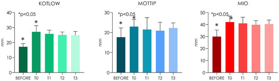 The Kotlow’s free-tongue measurement, MIO and MOTTIP were recorded before and after the procedure (T0), at one week (T1), one month (T2) and two months (T3) using a special designed case report form. The study data were statistically analyzed through the statistical software package GraphPad 8 (Prism, San Diego, CA USA). The normal distribution of the study data was assessed by the Kolmogorov–Smirnov test followed by Pearson’s Correlation test. The One-Way ANOVA Tukey’s was applied for a multiple comparison test considering a level of significance for p < 0.05.