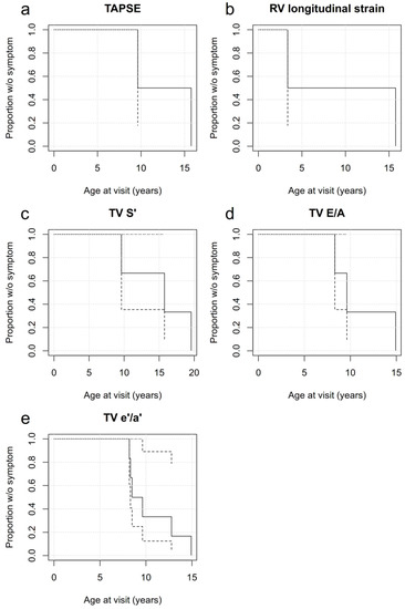 Figure 5. (a)–(e). Survival curves of proportions of patients without specific pathological RV functional parameters. With age, the probability of developing abnormal RV function increases according to age-dependent normative data. The dotted line indicates the 95% confidence interval.