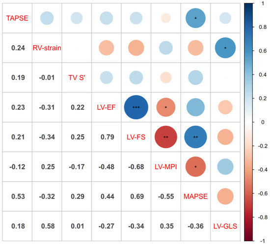 Figure 6. Correlation matrix: the size of the circles on the right side of the matrix correspond to more correlation, positive or negative (color code: blue positive and red negative correlation); the corresponding r values are displayed on the left side of the matrix. “*” corresponds to the calculated significance levels: * = p ≤ 0.05, ** = p ≤ 0.01, *** = p ≤ 0.001. Note that higher values of LV-MPI indicate cases with DCM, and that strain values are negative, i.e., values closer to zero indicate reduced, and more negative values better myocardial strain. For the remainder of displayed parameters, more positive values indicate better ventricular function.