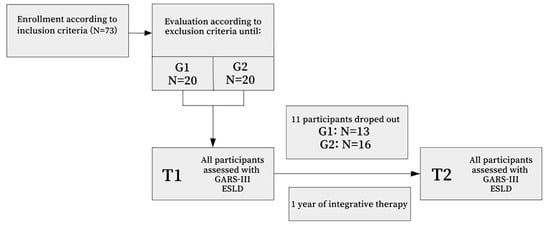 Firstly, we used the following inclusion criteria for entering the study: an established diagnosis of ASD and age of 36 to 60 months, after which children were continuously assessed for exclusion criteria until 20 participants were found for the G1 group (children 36 to 47 months old) and 20 participants were found for G2 group (children 48 to 60 months old). Evaluation for exclusion criteria was performed for 73 children, and 40 children started the intervention process (Figure 1). During the following year, 11 children dropped out of the therapy. The final number of participants included in the further analysis was 29 (Table 1). Groups were balanced for performance IQ, which was assessed using the Binet–Lezin scale [35].
