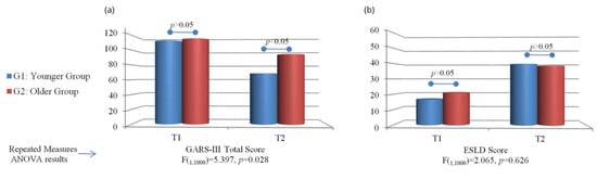 Average scores on (a) GARS-III and (b) ESLD for G1 and G2 at two time points and repeated measures ANOVA results.