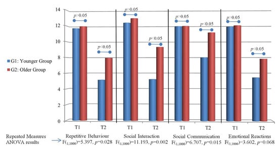 Our results of GARS-3 regarding the Autism Index for the total questionnaire and each subscale are given in Figure 2a and Figure 3 (see also Appendix A). At the first testing, there was no statistically significant difference between the groups (p > 0.05) for the total questionnaire and all subscales. In the second test, there was a statistically significant difference for the total questionnaire and all subscales separately (p < 0.05). There was a statistically significant difference between T1 and T2 for the total questionnaire, repetitive behaviour, social interaction, social communication, and emotional reactions for G1 and G2 (p < 0.05).