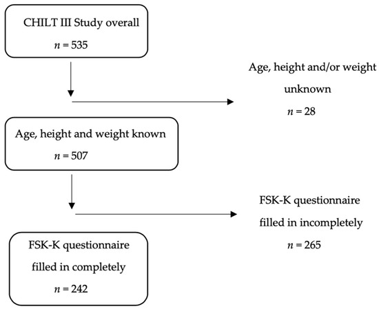 Data from the children’s health interventional trial (CHILT) III, an outpatient, multimodal, family-based weight management programme for children and adolescents aged eight to sixteen years [21] (n = 535), were examined. The CHILT Project is registered in the German Clinical Trials Register under ID DRKS00026785. To be included in the study, complete records on sex, age, height, and weight, as well as the FSK-K questionnaire (questionnaire for the assessment of self and competence in children) of the participants had to be available (n = 242; Figure 1).