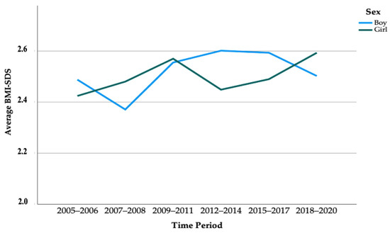 Secular trend of average BMI-SDS between 2005 and 2020 separated by time periods and sex. p = 0.631 according to an analysis of covariance (ANCOVA).