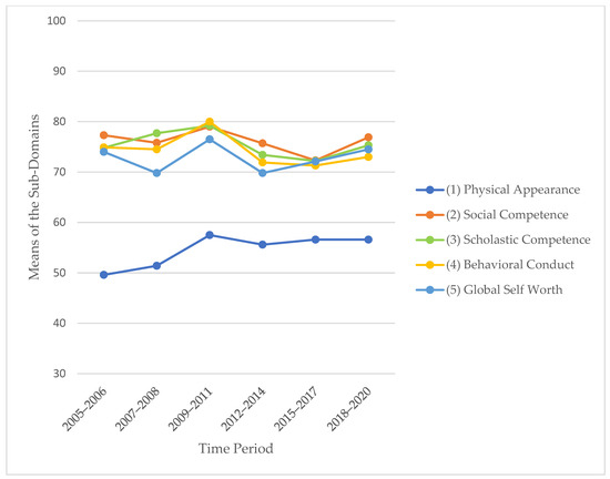Means of the five sub-domains of self-concept (recoded data scaled 0–100) in the different time periods.
