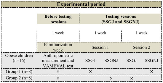 During regular PE lessons, 2 sessions of a 4-a-side SSG were fulfilled, split by a one-week interval. Each testing protocol was repeated once and consisted of so-called SSG-J teams (3 vs. 3 normal weight children plus 2 OCs participating as jokers in each team) and SSG-NJ teams (3 vs. 3 normal weight children plus 2 non-joker OCs in each team); therefore, there were a total of 16 teams and each team was composed of 3 normal weight children and 1 OC. During the experimental week, entrants were divided into 2 groups with 8 OCs completing SSG-J and the other 8 completing SSG-NJ in a randomized and counterbalanced order. In total, each OC completed the SSG-J and the SSG-NJ once (Figure 1). The length of each SSG intervention was 18 min. The profile of mood states (POMS) was evaluated before and after each trial (SSG-J and SSG-NJ) and the HR was continuously monitored during each session. Furthermore, RPE, a fingertip blood sample and physical activity enjoyment scale (PACES) were recorded immediately after the trial. OCs finished PACES separately so as not to listen the other children’s responses. All measurements were taken on the same school indoor sports hall during regular PE lessons. All OCs refrained from strenuous exercise for at least 48 h prior to experiments. All OCs became accustomed to the RPE, PACES and POMS questionnaire and to the SSG system prior to the start of the experimental session in order to minimize any learning effects during the study. The same PE teacher collected the data obtained in the tests of each session.