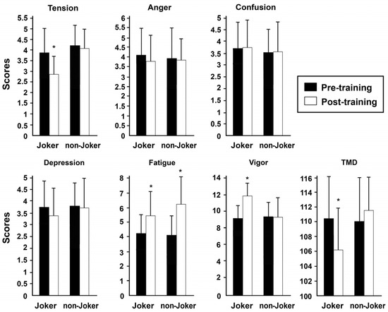 To evaluate the effect of “Group” (with and without joker players), “Time” (pre and post training) and “Interaction” (Group × Time) on mood responses (POMS scores), a two-way analysis of variance (ANOVA) was used. The results were considered significant at the 95% confidence level (p ≤ 0.0).