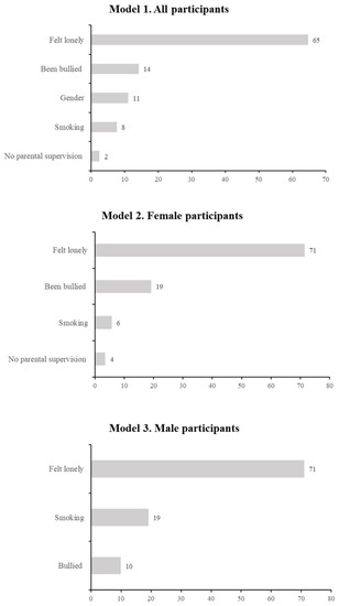 This study also found that feeling lonely, being bullied and smoking were common determinants of depression for both male and female adolescents. In addition, feeling lonely was ranked as the most important variable as it accounted for 65% to 71% of the variance in depressive symptoms among adolescents, followed by bullying at 10% to 19%, across all three models. While our findings echoed previous studies, there is no universal consensus regarding the most important predictor for depressive symptoms among adolescents [61]. Traditionally, gender, race, health status and loneliness have been reported as important predictors of depressive symptoms [62].