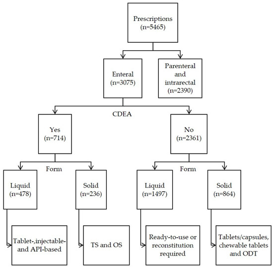 Flow chart of prescription type identification results. Abbreviations: API, active pharmaceutical ingredient; CDEA, compounded drug for enteral administration; ODT, orodispersible tablet; OS, other solid; TS, tablet splitting.
