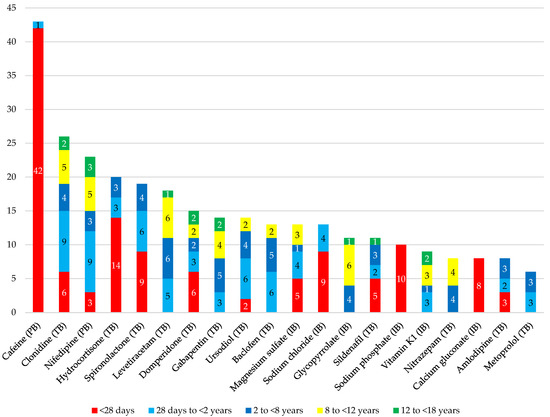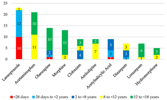 Of the 390 prescribed enteral drugs, almost one third required compounding (n = 122). Sixty-seven drugs were compounded into solutions, suspensions, or syrups and 73 CDEA were solid forms. The twenty most prescribed liquids and ten most prescribed solid CDEA in the total population are shown in Figure 2 and Figure 3, respectively. Therapeutic areas for compounded drugs according to the AHFS classification were the central nervous system (35%), cardiovascular (21%), gastro-intestinal (12%), electrolytic, caloric and water balance (9%), hormones and synthetic substitutes (7%), and other drugs (16%). Despite tablet-based liquids being the most prescribed type of CDEA, caffeine as an API-based solution was the most frequent CDEA overall (n = 43), almost exclusively given to neonates. The splitting of lansoprazole orodispersible tablets (ODT) (Prevacid® FasTab) (n = 23) was the most common solid CDEA, with 22 prescriptions for patients under 2 years of age. Lansoprazole was closely followed by acetaminophen tablet splitting (n = 23), exclusively prescribed to children over the age of 8.