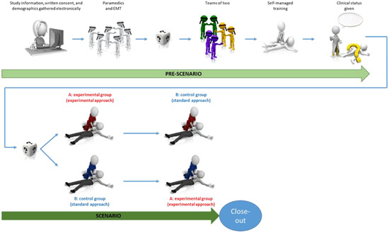 The scenario will start with a clinical description to expose the life-threatening condition of the patient. One of the investigators will state: “Here is Cayla, a 9-month-old child who was left unattended for 10 min. She was found cyanotic by her parent who called the emergency call center. A few minutes later, she collapsed. She is now unconscious, limp, cyanotic, and apneic. A medical mobile unit has already been dispatched and will be on site in about ten minutes.” A rephrasing will be asked of the team leader to ensure correct understanding (closed-loop communication). The team leader will then pick up the top envelope of the stack, and open it to discover the path to follow, starting either with the standard or experimental approach. The simulated child will be apneic and pulseless if checked. After placing the pads, asystole will be displayed on the defibrillator’s screen. CPR waves will be automatically shown when compressions are delivered to increase the fidelity of the simulation. Regardless of the treatment given, all subsequent rhythm analyses will show refractory asystole. Participants will be able to successfully obtain intraosseous/intravenous access on their first attempt. There will be no further intervention or educational follow-up after the study period. Team members will be asked to alternate their position after every 2 min cycle. At the end of the scenario (T0 + 10 min), participants will be shown a normal sinus rhythm, and ROSC will be present. All the equipment will be fully restored. Then, the same scenario will be played a second time using the other airway management strategy, with no more interactions between the study team and the participants nor between the participants.