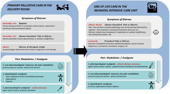Figure 1. Pain and symptoms of distress during the process of dying—differences between primary palliative care in the delivery room and in end-of-life care the neonatal intensive care unit [adapted from Garten and von der Hude (2016) [27].