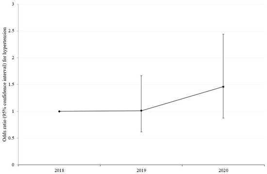 WC (p = 0.006), WHtR (p = 0.001), and the proportion of participants with WHtR > 0.5 (p = 0.036) increased from 2018 to 2020 (Table 1). Additionally, DBP (p = 0.018) and the proportion of participants with hypertension (p = 0.016) also increased during this period (Table 1). In logistic regression, the odds ratio of hypertension in 2020 was not significantly higher when compared to those in 2019 after adjusting for age, sex, BMI, and WC (Figure 1).
