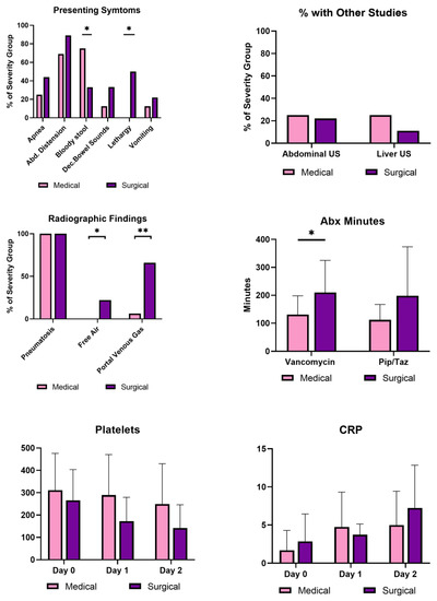 The surgical group had significant differences in presenting symptoms, laboratory values, and time to receipt of antibiotics to the medical group (Figure 2). They presented more often with lethargy (55% v 0%) but less often with bloody stool (33% v 68%) than the medical group (p < 0.05). As to radiographic findings, they showed significantly more portal venous gas (p < 0.05) and pneumoperitoneum (p < 0.001) on initial radiography than the medical group.