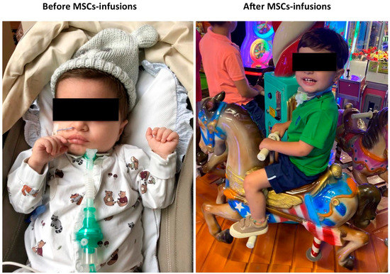 In the absence of a control period without an additional therapeutic option, it is not possible to define the final prognosis without cell-based treatment, and an improvement of pulmonary function without MSC infusions could also not be excluded. We cannot exclude that the progressive decrement of narcotic analgesics and immunosuppressive therapy and the physiological maturation of the respiratory and immune systems could be related to the improvement of the clinical condition. However, the well-known action of MSCs in the repair of lung tissue, promoting a normal alveoli and pulmonary vessel [6,9,35], together with the sequence of events observed in our patient, may support the therapeutic role of MSCs in this clinical condition. Long-term monitoring will be mandatory to define the beneficial effects of this treatment.