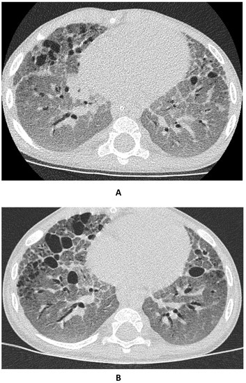 - Mechri, M.; Epaud, R.; Emond, S.; Coulomb, A.; Jaubert, F.; Tarrant, A.; Feldmann, D.; Flamein, F.; Clement, A.; de Blic, J.; et al. Surfactant protein C gene (SFTPC) mutation-associated lung disease: High-resolution computed tomography (HRCT) findings and its relation to histological analysis. Pediatr. Pulmonol. 2010, 45, 1021–1029. [Google Scholar] [CrossRef] [PubMed]