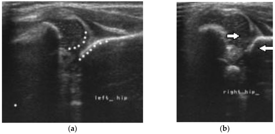 - Harcke, H.; Grissom, L.E. Infant hip sonography: Current concepts. In Seminars in Ultrasound, CT and MRI; WB Saunders: Philadelphia, AR, USA, 1994; Volume 15, pp. 256–263. [Google Scholar]