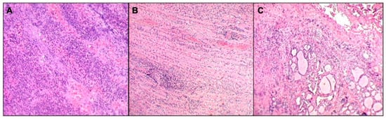 Histopathological image. Suppurative inflammatory process (A) involving neck striated muscle fibers, focally destroying and dissociating them (B), and thyroid tissue (C). Neither cellular atypia nor microorganisms were detected.