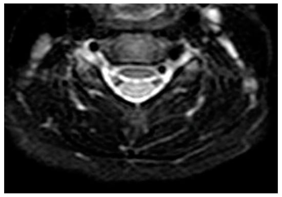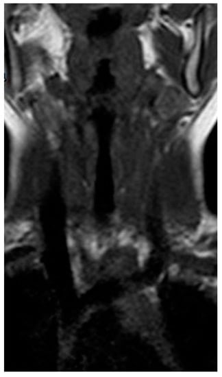 The use of magnetic resonance (MRI) is limited, although it is recommended by some authors for its higher soft tissue resolution and easier identification of multiple sites involvement in the neck than contrast tomography (CT) []. In DNSI, MRI shows an increased tissue contrast and an hypointense to intermediate intensity T1 signal, T2 hyperintensity, restricted diffusion, and peripheral enhancement on postcontrast T1 sequences [].