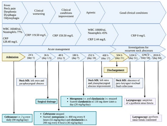 We describe the case of a 5-year-old boy admitted to our Pediatric Department, in Chieti (Italy), due to fever and left cervical region neck pain, dysphonia, dysphagia, and odynophagia. Symptoms occurred six days prior to hospitalization. The patient was firstly treated at home without any clinical improvement with amoxicillin/clavulanate (60 mg/kg/day) for three days, then with azithromycin (10 mg/kg/day) for another three days, and with betamethasone (0.1 mg/kg/day) for one day. In his past medical history, two similar episodes, characterized by fever and left neck pain, were described: the first one at age 3 years and treated with amoxicillin/clavulanate (50 mg/kg/day) for five days with clinical improvement; the second one at 6 months before this hospitalization and was self-limited. There was no medical history of immunosuppression. There was no other medical condition or physical abnormality to be considered. Upon admission, the child showed uncomfortable conditions characterized by fever (38.2 °C), cervical pain, and restricted cervical range of motion (Table 1: differential diagnosis in children with neck pain and torticollis). Neck swelling and abnormal head posture were not evident. Medical examination showed pharyngeal hyperemia and bilateral cervical and submandibular lymphadenopathy without neck stiffness. Vital signs were normal (heart rate: 138 beats per minute; oxygen saturation: 100% breathing room air; respiration rate: 22 breaths per minute; systolic blood pressure: 96 mmHg; diastolic blood pressure: 68 mmHg). Cardiorespiratory examination was normal. Blood exams showed neutrophilic leukocytosis (white blood cells 16,040/μL, neutrophils 12,410/μL, lymphocites 2180/μL, monocytes 1390/μL), and increased C-Reactive Protein (128.40 mg/L; normal value < 10 mg/L), but normal procalcitonin value (0.120 ng/mL; normal value: less than 0.5 ng/mL). Hemoglobin value was 13 g/dL (normal value: 11.4–14.3 g/dL). Severe acute respiratory syndrome coronavirus 2019 (SARS-CoV-2) real-time-PCR nasopharyngeal swab was negative. After the first clinical evaluation, to rule out a neck abscess, we decided to start an empirical broad-spectrum antibiotic treatment with intravenous ceftriaxone (90 mg/kg/day).
