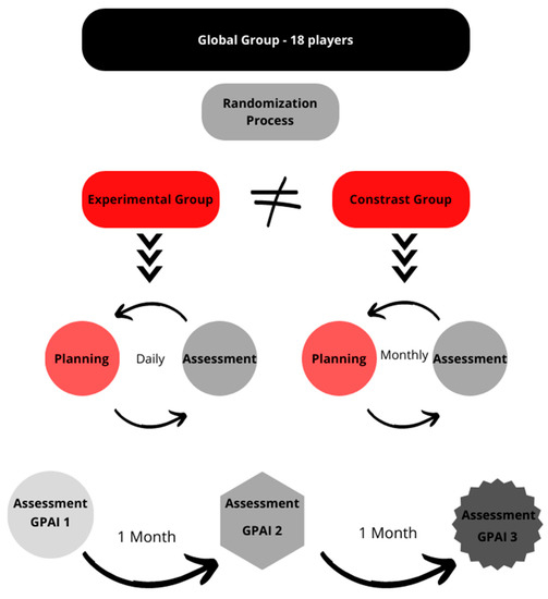 All 18 players finished the season, and thereby 100% of the eligible sample was recruited and completed the experiment (Figure 2). The focus of the results was not on the individual evolution of the players, but the adaptations to the planning performed in both groups, and the readjustments performed throughout the assessment moments. The analyses were focused on the training process, namely the interplay between planning and assessment in both groups, and the barriers and opportunities associated with this type of research.