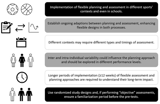 We recommend the careful planning of the learning process; however, a careful and sustainable planning process should be flexible and adaptable to multiple changes over time. Plans that are too detailed ignore intra- and inter-individual variability, inherent characteristics in any learning group. This adaptability of planning should not only be individualized to learners’ necessities, but also flexible to external constraints. These adaptations over time in planning should be guided through ongoing assessments, and these can provide useful insights about learners’ evolutions and diagnostic special needs to aid planning. A flexible plan is open to receiving information from assessment and can adapt in order to respond correctly to actual learners’ needs. In the same way, the assessment tools should adapt to different constraints, issues, and contexts that the learner needs to solve over time. The assessment itself should be assessed (i.e., meta-assessment), as a result of reflection about the learning process, and for consideration of what the next steps are that coaches and teachers want their learners to undertake. Future research is recommended in this area of planning and assessment bidirectional interaction, especially during longer periods of time and in different contexts.
