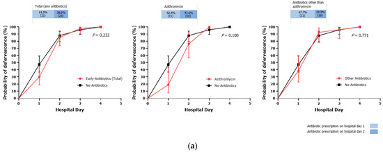 Of 125 patients with fever during hospitalization, the rate of fever defervescence by hospital day 3 was 96.8%. There were no significant differences in defervescence by hospital day 3 between the early and no-antibiotic groups: early (any antibiotics) vs. no-antibiotic, 97.9 vs. 95.9%; azithromycin vs. no-antibiotic, 100.0 vs. 95.9%; antibiotics other than azithromycin vs. no-antibiotic, 96.1 vs. 95.9% (all p-values > 0.999). There was no statistical difference in defervescence curves between the three groups (Figure 3a). The median LOS was 4 days (range, 2–10; IQR, 3–4) in all patients, and there was no difference between the early antibiotic groups and no-antibiotic group (Figure 3b). Among all study patients, no patients had concomitant Campylobacter bacteremia or needed intensive care unit admission.