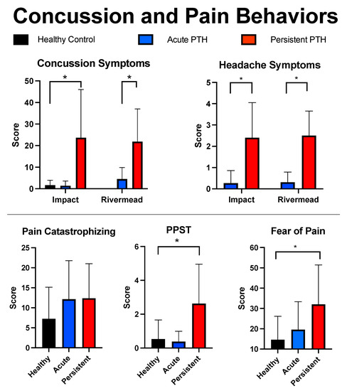 Self-reported symptoms. Findings are outlined for the three cohorts using mean and standard deviations for the main mTBI and pain questionnaires. mTBI symptom reporting is provided for the Impact and Rivermead mTBI surveys. * indicates a p-value less than 0.05.