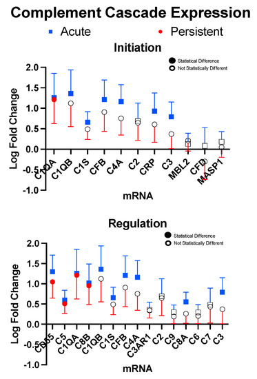 Initiation and Regulation of the complement cascade. Markers are presented for factors that were found for at least one cohort to be above detectable limits. Samples were found to be statistically significant (filled boxes or circles) if they had p-values < 0.05. Error bars represent one standard deviation.