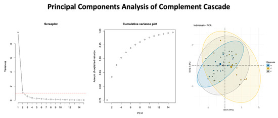 The top five candidate markers from the first component (Greater than the loading of 3) were retrieved (Figure 3 for PCA findings and Figure 4 for group outcomes). This gave five target molecules that were evaluated between PTH cohorts and healthy controls. Relative to healthy controls, the A-PTH cohort had greater expression of C1QA, t(26) = 2.43, p = 0.022, C1QB, t(26) = 2.16, p = 0.04, C4A, t(25.6) = 2.76, p = 0.01, C8B, t(25.6) = 2.15, p = 0.04, and CFB, t(24.6) = 3.077, p = 0.005. For the P-PTH cohort, only C1QB, t(26) = 2.16, p = 0.04, and C8B, t(26) = 2.15, p = 0.04, were found to be significantly more expressed than healthy controls (Figure 4).
