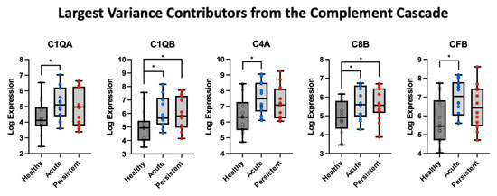 Five highest contributions to the first component from the PCA analysis of the complement cascade. The log expression values were evaluated in each cohort relative to healthy control data, with * indicating a p-value less than 0.05.