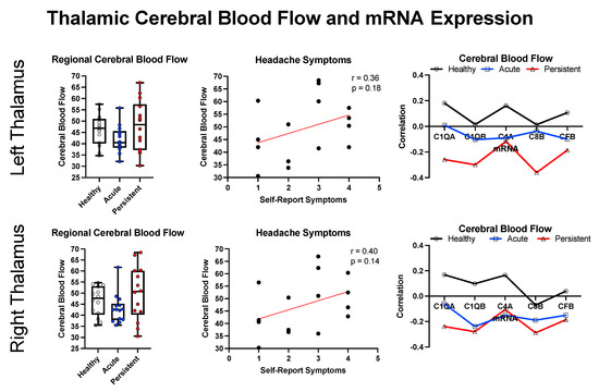 We elected to explore relationships between cerebral blood flow, symptom presentation, and inflammation in relation to the left and right thalamus based on the thalamus displaying hyperconnectivity in early stages after mTBI [41] and being a target for C1Q-mediated inflammation [42] after cortically-focused brain injury (mouse model). As shown in Figure 5, there is a trend towards decreased CBF in the A-PTH cohort and more variable CBF in the P-PTH cohort. For the P-PTH cohort, CBF had a positive relationship with self-reported headache symptoms. In relation to the top five inflammatory markers, there appeared to be a shift in the canonical relationship between mRNA expression and CBF that progressed in the healthy controls to A-PTH and was greater in the P-PTH cohort.