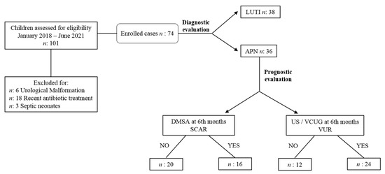 The Pediatric Nephrology and Dialysis Unit, University Hospital “G. Martino” Messina, Italy, conducted the enrollment from January 2018 to June 2021, enrolling seventy-four febrile pediatric patients with suspected UTI/APN.
