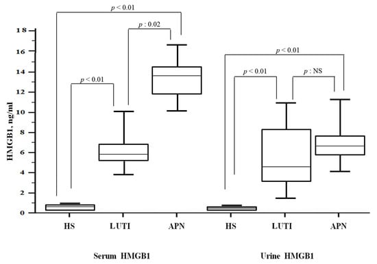 This analysis supports our data about high uHMGB1 levels assessed only in LUTI patients as an expression of limited urinary infection, without a systemic impairment, as occurred during APN (Figure 4).