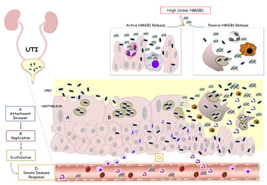 HMGB1 involvement in urinary tract infection. Uropathogenic Escherichia coli (UPEC) binds and invades the urothelium (A,B). Host inflammatory responses begin to clear extracellular bacteria. However, some bacteria evade the immune system, producing toxins and proteases that induce host cell damage with a final cell exfoliation (C). The activation of the innate immune system is based on the secretion of chemical mediators, such as chemokines and cytokines (D). In this contest, HMGB1 is passively released into urine from damaged or necrotic cells or actively released from activated cells, such as inflammatory cells and immune cells. High urine levels of HMGB1 characterized children with lower UTI.