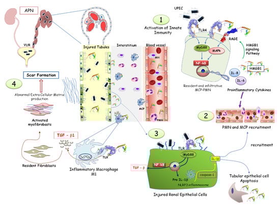 Children with APN are vulnerable to renal scarring due to the necrosis and fibrosis associated with acute systemic inflammation. The release of various mediators, including HMGB1, amplifies the clinical expression of APN, with systemic involvement not only restricted to the kidneys. Conversely, in LUTI, cytokines are secreted mainly in the urine, without a systemic disease [36].