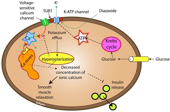 Diazoxide is a nondiuretic benzothiazidinic systemic vasodilator originally formulated for severe hypertension [8,9]. Diazoxide causes smooth muscle relaxation leading to systemic and pulmonary vasodilation [9]. Diazoxide was noted to be diabetogenic in the 1960s, and it was suspected that diazoxide blocks insulin release [10]. Diazoxide raises glucose concentrations by suppressing insulin secretion (Figure 1). The mechanism of action of diazoxide is by blocking sulfonylurea receptor 1 subunit of KATP-channel on pancreatic beta (ẞ) cells, which increases the permeability to potassium ions, resulting in hyperpolarization of the cells. Hyperpolarization of the ẞ-cells inhibits calcium-dependent insulin secretion [6,9]. These KATP-channels are also involved in smooth muscle relaxation and dilation of coronary arterioles [11], so diazoxide causes arteriolar dilation with little to no effect on the venous system [12].