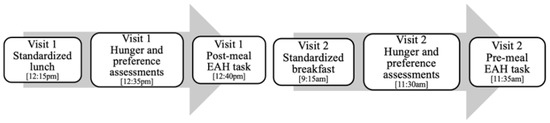 Parents and their children visited the laboratory for two separate 2-h visits. Session 1 assessed children’s candy intake after a meal. Parents were instructed to provide breakfast at home and a standardized lunch was provided. Children also completed a hunger and food preference assessment with research staff and participated in the standard EAH protocol. While children participated in the EAH protocol, parents completed paper surveys. Survey responses were double entered by research assistants and any discrepancies were reviewed and resolved. Session 2 assessed children’s candy intake before a meal. In this condition, children ate a standardized breakfast followed by a 2-h break. Next, children completed a hunger and food preference assessment with research staff and then participated in the EAH protocol. This session occurred 2–3 months after session 1. See Figure 1.