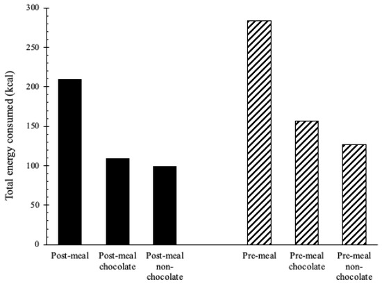 There was no significant difference in the amount of total candy children consumed between conditions: post-meal (mean = 209.3 kcal; SD = 111.25; range = 48.3–463.7 kcal) and pre-meal (mean = 283.6 kcal; SD = 167.3; range = 2.3–786.5 kcal) (p = 0.15). There was also no significant difference in the amount of chocolate candy children consumed between conditions: post-meal (mean = 109.7 kcal; SD = 100.25; range = 0.0–386.0 kcal) and pre-meal (mean = 156.6 kcal; SD = 135.1; range = 0.0–653.1 kcal) (p = 0.78). However, children consumed significantly less non-chocolate candy during the post-meal condition (mean = 99.5 kcal; SD = 72.4; range = 0.0–331.3 kcal) than the pre-meal condition (mean = 127.1 kcal; SD = 120.0; range = 0.7–413.9 kcal) (p = 0.05). Figure 2 shows candy intake by condition.