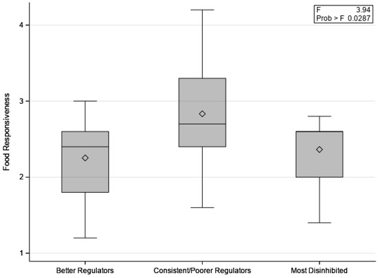 Means of children’s food responsiveness for “Better Regulators” (n = 15), “Consistent/Poorer Regulators” (n = 12), and “Most Disinhibited” (n = 11) groups.