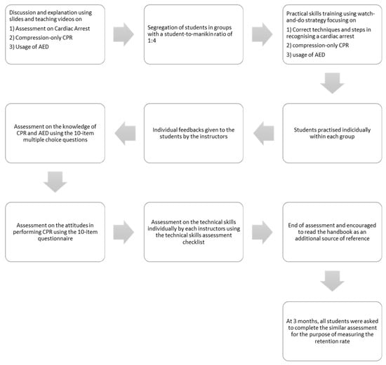 However, the Malaysian national school curriculum currently lacks certain subjects and tools to enforce CPR []. CPR teaching has only been implemented in the Malaysian secondary school curriculum embedded as several topics in a subject called “Pendidikan Kesihatan” (Health Education). In the context of primary schoolchildren, there is no CPR teaching conducted during the school period. Moreover, no specific course or handbook has been designed to address this topic, failing to fulfil the requirement of the WHO policy [], which recommends at least two hours of annual training, including theory and practical training, at all levels of education. To address this limitation, in this study, we developed a compression-only cardiopulmonary resuscitation and automated external defibrillator course for primary school students. The first objective was to assess the preliminary efficacy of the course on primary school students’ knowledge, technical skills, and attitudes and, secondly, to measure the retention rate of the students 3 months following the course.