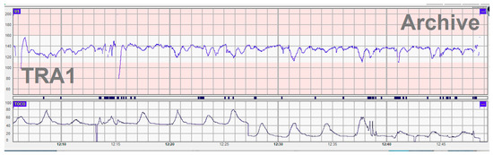 Given that the mother was hospitalized shortly before birth, the appearance of CTG can also be considered as part of gradual hypoxia in the decompensated phase, when the variability disappears and the baseline decreases [14].